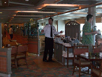 There are several options for dining, too. When you book a cruise, you choose an evening dining time, either early (around 5:30 or 6 PM) or late (around 8:30), and at the appointed time you head to the dining room assigned to you. Keep in mind, most of these ships carry between 1000 and 4000 people, so they provide multiple dining rooms. When you show up there, you are shown to your table, complete with white tablecloths, beautiful place settings, crystal glasses, and real flowers in the vases. (I don't know how they do that one on longer cruises...where do they keep flowers to keep them fresh that long?)